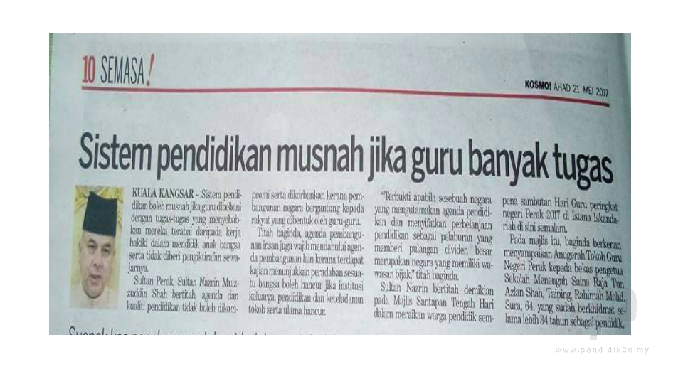 Sistem pendidikan musnah jika guru banyak tugas, Sultan Perak Sultan Nazrin bertitah sekiranya guru dibebani dengan tugas-tugas lain sehingga menyebabkan tugas hakiki mereka terabai boleh menyebabkan sistem pendidikan negara musnah. Berikut keratan akhbar kosmo.