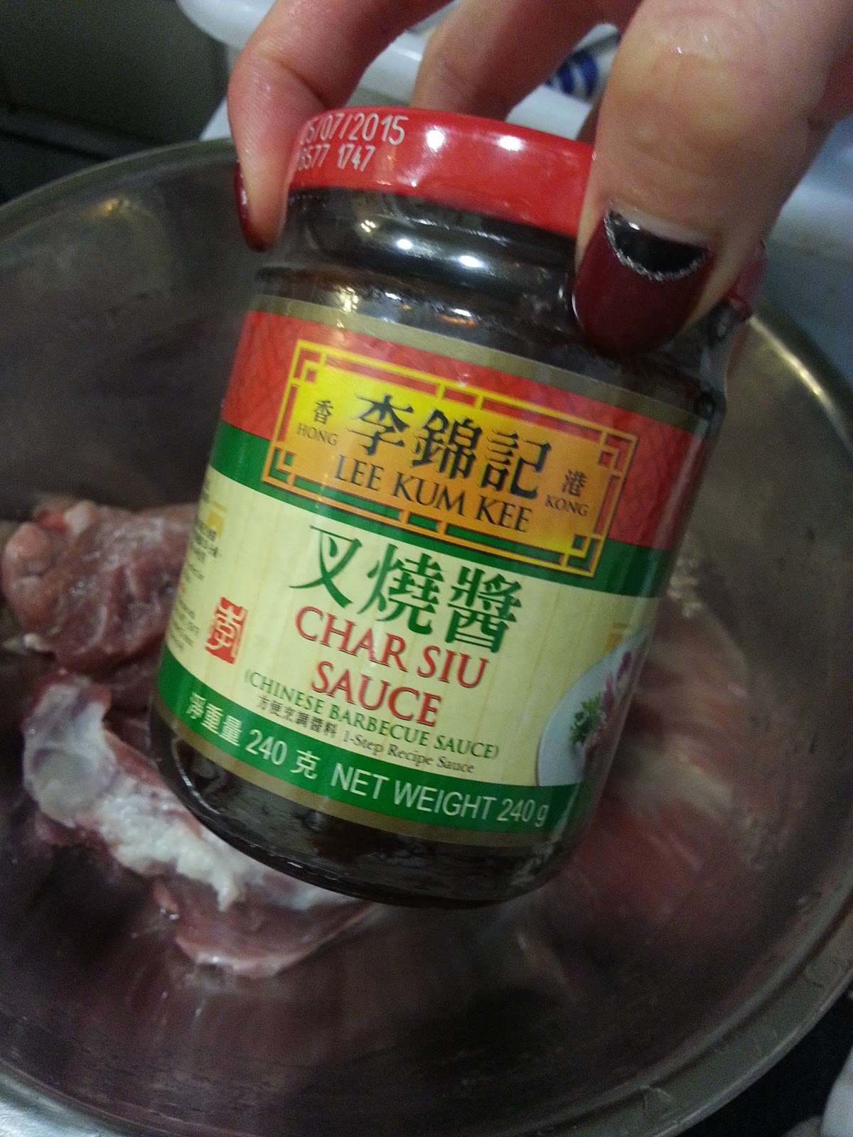 好喇~材料準備如下: 2-3人份 (看圖份量,只有兩小塊)1. 枚頭豬肉或豬柳 (我買半肥瘦的枚頭豬肉,約30蚊) 400克2. 薑汁 一小匙3.蜜糖 (有人用麥芽糖,但我用燒烤蜜糖,買錫紙送的~不用浪費~)4. 李錦記叉燒醬 6湯匙5. 雙蒸酒或紹興酒 3湯匙6. 生抽 (light soy sauce) 2湯匙