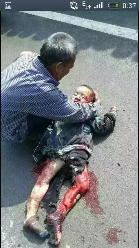 小男孩的双脚被皮卡车压着骨头都断完了,只剩下皮了,脚都可以折起来了,裤子都磨烂完了,只剩下最后一口气了,不知道是否能存活,让我们一起为这位小男孩祈福吧!!!