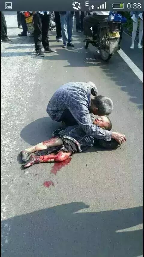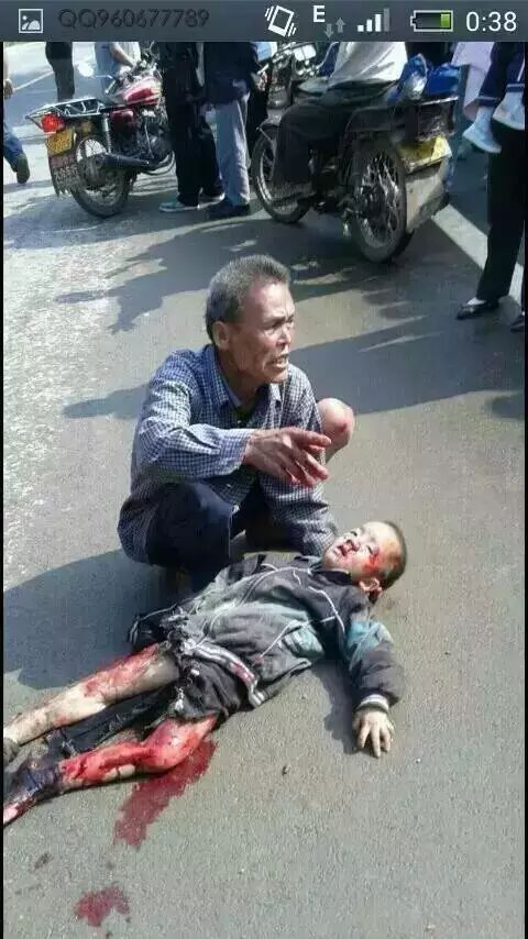 他爷爷带着他去赶集,回家的路上不幸被一辆皮卡车撞倒, 开车的司机把车停了下来,脑袋往车窗伸出来往后看了看,小男孩的爷爷也赶紧从摩托车上下来,就在这时,皮卡车飞快的开走了,连车带人一起开拖走了,他爷爷去追,怎么也追不到,这位小孩被皮卡车从河路口收费站一直拖到207国道往南那边的河路口中学下面的木材检查站。