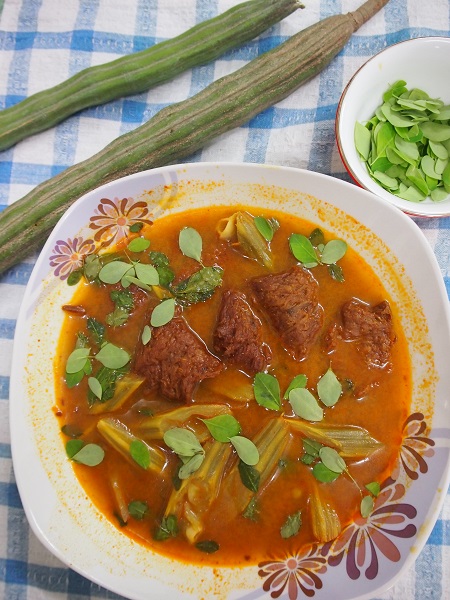 2.辣木素咖哩羊肉湯療效:健脾開胃、利濕。適宜胃口不佳、食欲不振、補充營養缺乏、風濕關節痺症。材料:鮮辣木莢果100g(選嫩莢果為佳),辣木葉適量,1包素咖哩羊肉200g(包含小麥纖維、大豆、玉米、香菇、辣椒、咖哩粉等研製成包裝)煮法:1.將辣木莢果刨去外皮切段。2.下鍋先煮約20分鐘,待莢果軟後,倒下素咖哩羊肉,再煮約5~8分鐘。3.盛起碗後,加入適量辣木葉(後下保住營養),即可食用。我贊辣木1.高詩詩辣木葉營養豐富,適合運動者服用,而且還能瘦身及改善便秘,其效果勝於瀉藥,因此我將辣木葉當作蔬菜食用,並自行研發“辣木葉蛋花湯”。其材料為辣木葉、雞胸肉/豬瘦肉、雞蛋及江魚仔。先用一點油及麻油,爆香江魚仔,加入適量水份,水滾後加入雞肉或瘦豬肉,最後加入辣木及雞蛋,也可添加鹽、雞精或胡椒粉等調味料。辣木葉煮湯後,其味道並不辣,而是帶有甜味,仿如菠菜的味道,此外,若辣木葉加入雞蛋,還能煎成蛋餅。往後,我還准備嘗試將辣木葉攪拌成汁,再加入麵粉糊成面,然後煮湯或板面。2.李綺蓮印裔朋友告訴我,辣木葉是他們的必備蔬菜,而且有助促進食慾,對方曾教導我煮辣木葉菜肴,味道相當不錯。准備姜絲及小蔥各一湯匙,辣椒絲適量,椰絲3至4湯匙。用油爆香姜及小蔥,加入辣木葉,炒一會兒後,再加入椰絲、辣椒、鹽及適量糖。炒熟後,一盤香噴噴的炒辣木葉,就大功告成。此外,辣木豆也可煮魚、蝦、螃蟹及咖喱雞,而我最愛的口味,就是與印度豆(Dhall)同煮。