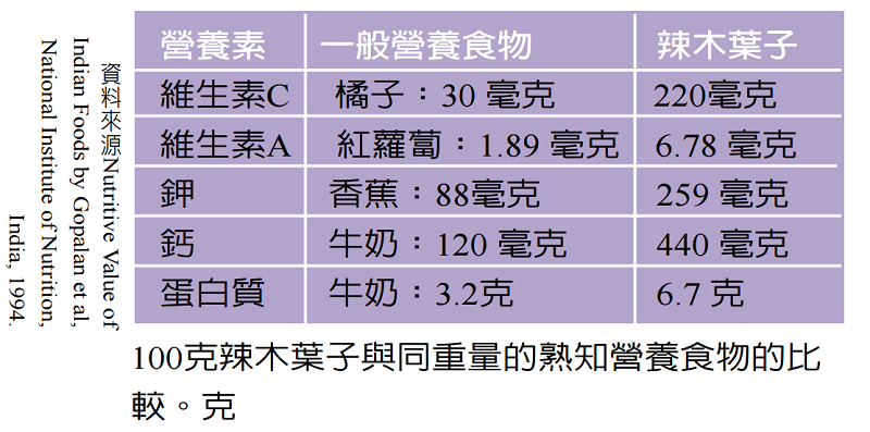 顧名思義,辣木是“辣”的“木”本植物,它含有“葡萄糖異硫氰酸鹽”(Glucosinolate),當被入口咀嚼後,則會分解產生“異硫氰酸酯”(Isothiocyanate),此類化合物即是其辛辣味的來源。順帶一提,芥末的辛辣味,同樣源於此化合物。辣木原產地為印度,是印度國寶級植物,其學名Moringa,就是源自淡米爾語。它與中國靈芝及美國西洋參,合稱為“世界三寶”,而且還有許多美譽:奇跡之樹、生命之樹、淨化之樹、植物鑽石、完美植物、不可思議之樹……經過研究開發後,日本與韓國將辣木製作藥膳、布丁、沙律及營養液,而台灣也曾掀起一股辣木熱潮,許多台灣人都種植此植物,較後這股熱潮傳至大馬,並被直銷界吹捧為“神奇療效”保健品。 除了保健品常用者,一般大眾對辣木不甚了解,而中醫對其也相當陌生。實際上,當你光顧嘛嘛檔,點用Roti Canai時,你已嘗過辣木之味,因為它是扁豆咖喱(Dhal Curry)的配料之一。對印度人而言,辣木是普遍不過的日常食物,許多印裔人戶都栽種辣木,並以其葉子炒菜,或將樹根磨粉作調味料,而在十五碑小印度,也能找到辣木葉販攤。在他們眼中,辣木本是一種廉價植物,卻被華商炒高售價。楊素雄中醫師表示,辣木花果葉根各部分,既有相同的營養,也有不同的功能,其中葉子富含維他命A、維他命C及鈣質;辣木籽(種子)可改善三高症狀;樹根含有生物鹼及辣木素,可對治風濕、尿酸、關節病及腸胃病,並具有殺菌功效。