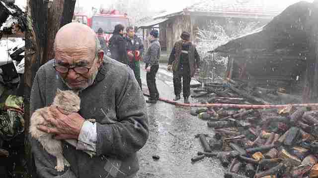 在一張情感照片中,Meşe被描繪成擁抱他受驚的貓,因為消防員正在調查傷害。