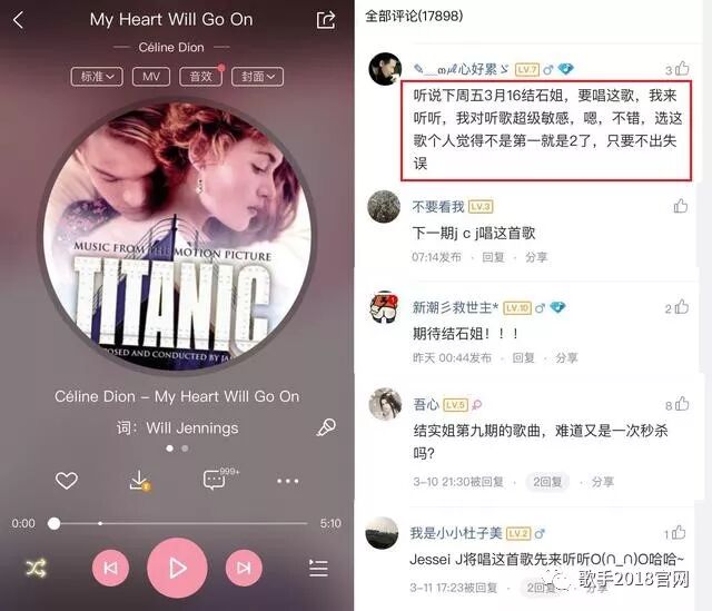 在酷狗音乐上,《My heart will go on》的评论数已近2万,不少听众因为Jessie J要在本周翻唱此曲,特意前来重温一遍原曲。有酷狗网友表示:“选这首歌,个人觉得不是第一就是第二了。”