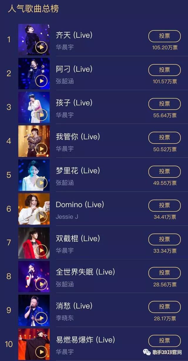 目前,在【酷狗-歌手人气歌曲总榜】上,Jessie J仅有一首《Domino》排名第六;而华晨宇几乎以大魔王的姿态霸榜,全部演唱歌曲均进入前十。本次结实姐演唱《My heart will go on》不知道能否感动听众们,冲击榜单的冠军宝座呢?