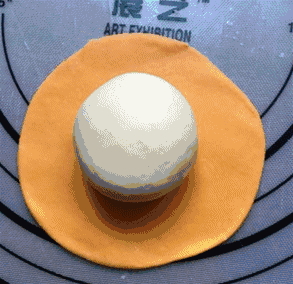 4.取一份20克南瓜麵糰擀成薄圓片,包上一個40克的白麵糰,包好收口朝下擀圓,均勻的切割成12份,中心部分不切斷