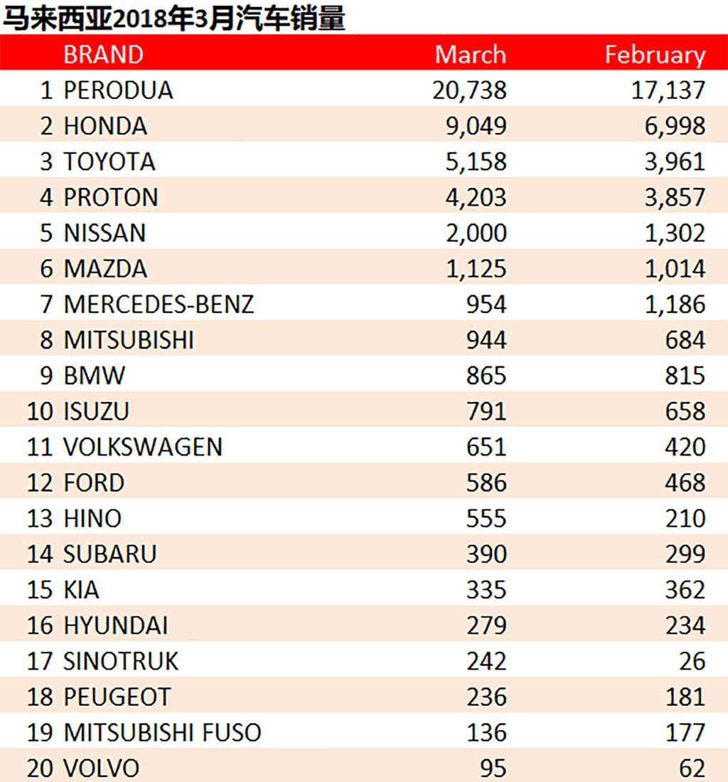 馬來西亞汽車公會(MAA)公布了2018年3月份馬來西亞汽車銷量報告。