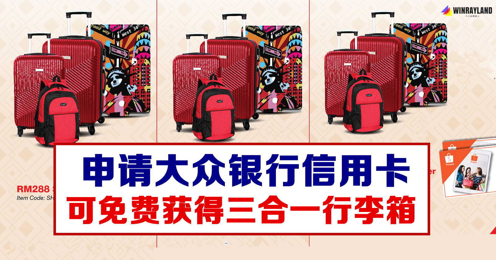 申請信用卡可獲得三合一行李箱,還有行李套!如今你只需上網申請大眾銀行(Public Bank)的信用卡,就有機會獲得三合一行李箱和行李套! 凡是在7月1日至12月31日申請大眾銀行信用卡並獲得批准,即可獲得3個行李箱和行李套。