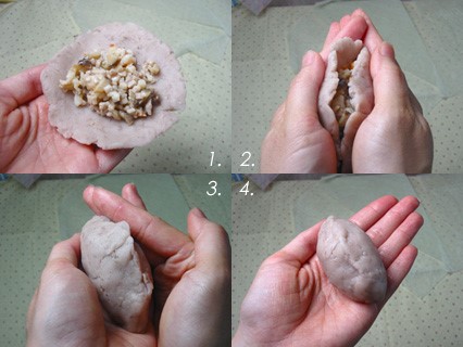 3. 將冷凍過的芋泥團搓成條狀,分成每份約25克的小團。准備空碟撒上澄粉,手也沾粉,然後按扁成小圓形包入餡料,合上捏密封口。