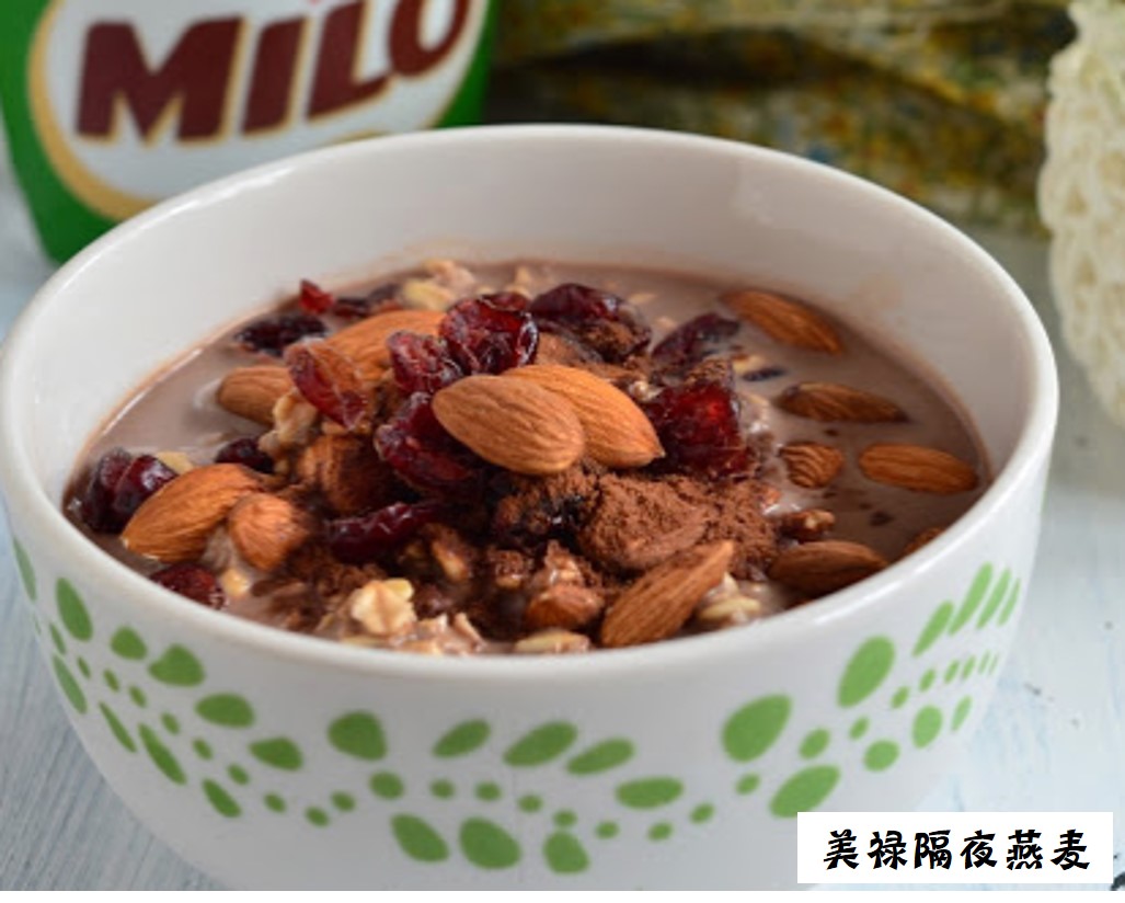 材料:牛奶 1杯,燕麥 ½杯,奇異籽 1茶匙,美祿粉 4湯匙,烤香杏仁 ¼杯,蔓越莓干 ¼杯