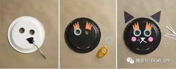制作步骤:首先将剪好的纸盘或小猫面具上的各种卡片,可以搭配各种鲜艳的颜色,然后在合适的地方挖两个孔,将纸盘涂色,并把纸片贴到纸盘上