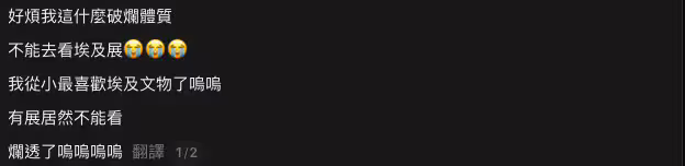 該名網友表示,「好煩,我這什麼破爛體質?不能去看埃及展。我從小最喜歡埃及文物了嗚嗚!有展居然不能看,爛透了嗚嗚嗚嗚。」