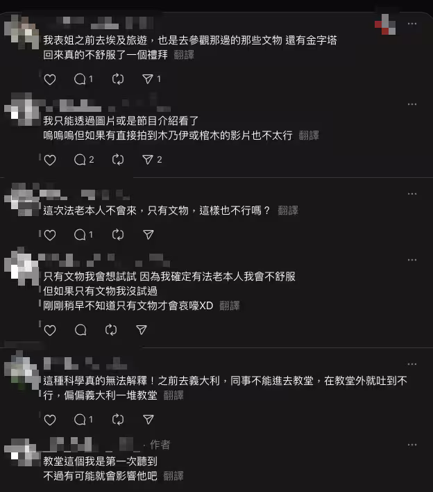 貼文曝光後,部分體質敏感的民眾,也在下方分享自身經歷,「之前去大英博物館看過埃及展,保平安的護身符身上也有,但還是差點吐出來,全身都很不舒服,頭很暈胸口很悶,一離開就好了!不知道是怎樣?但同行友人都麻瓜無感」、「不用埃及展,現在的奇美兵器還有動物標本就夠暈了」、「我最嚴重有暈到沒辦法走路過」、「我表姐之前去埃及旅遊,也是去參觀那邊的那些文物,還有金字塔,回來真的不舒服了一個禮拜」、「這種科學真的無法解釋!之前去義大利,同事不能進去教堂,在教堂外就吐到不行,偏偏義大利一堆教堂」、「我也很想去,但我覺得我應該是承受不住」、「之前木乃伊展我有去,裡面只有空棺,我一靠近頭就痛到不行」。