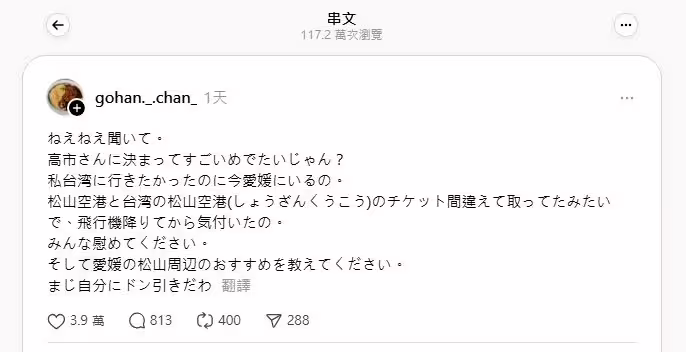 她興高采烈從東京羽田機場出發,因為是第一次出國,搭了國內線也沒察覺,完全忘記應該要有出境、護照查驗等手續。櫻花妹表示羽田機場的第二航廈有時也會飛國際線,所以她完全沒想到自己會訂錯機票,飛機上播日本新聞畫面也沒注意到,只顧著悠哉看書。「太依賴GPT了」,飛機落地後她才驚覺自己沒出國,只好發文求大家推薦愛媛有哪裡好玩。