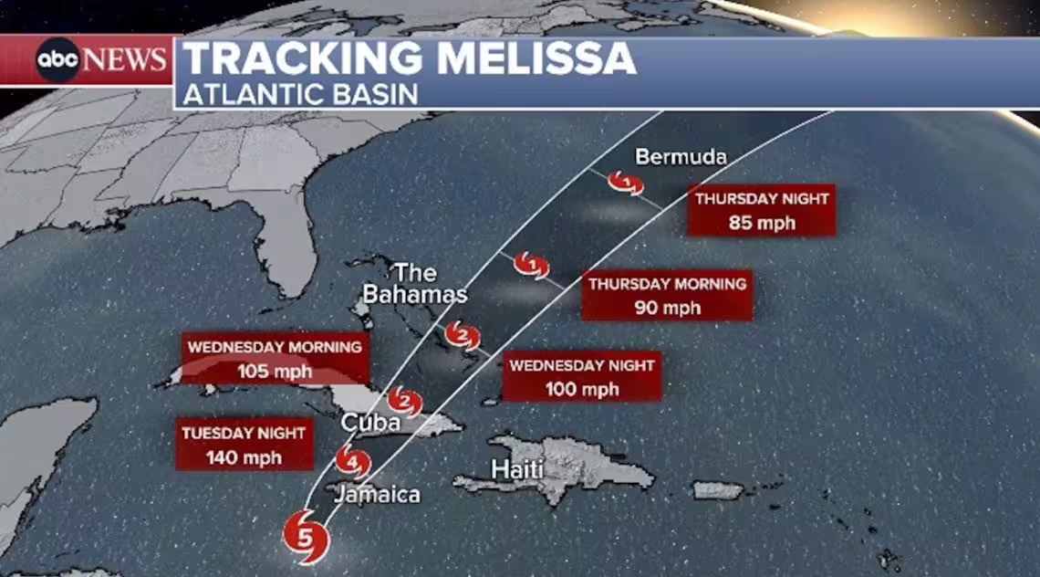 根據媒體《CNN》報導,梅麗莎以5級颶風之姿重創加勒比海地區,美國國家颶風中心 (NOAA) 判定中心最大平均風速達150kt、陣風185kt,且梅麗莎結構紮實、颶風眼清晰可見,近中心風速甚至還有再增強趨勢。