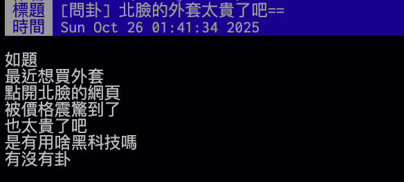 原PO表示,最近想買外套,點開北臉的網頁,被價格震驚到,「也太貴了吧!是有用啥黑科技嗎?有沒有卦?」