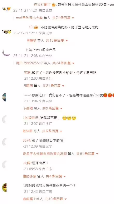 然而,對中國消費者來說,印度海鮮的「進軍中國」消息反應卻截然不同,相關新聞登上微博熱搜後,不少網友紛紛崩潰留言,「不要進來啊」、「送我都不要」、「先不要」、「日本剛走,一個更狠的來了」、「為什麼要在核輻射和大腸桿菌中選擇?」、「看新聞起雞皮疙瘩了」、「要我吃恆河的魚,我寧願餓死」。