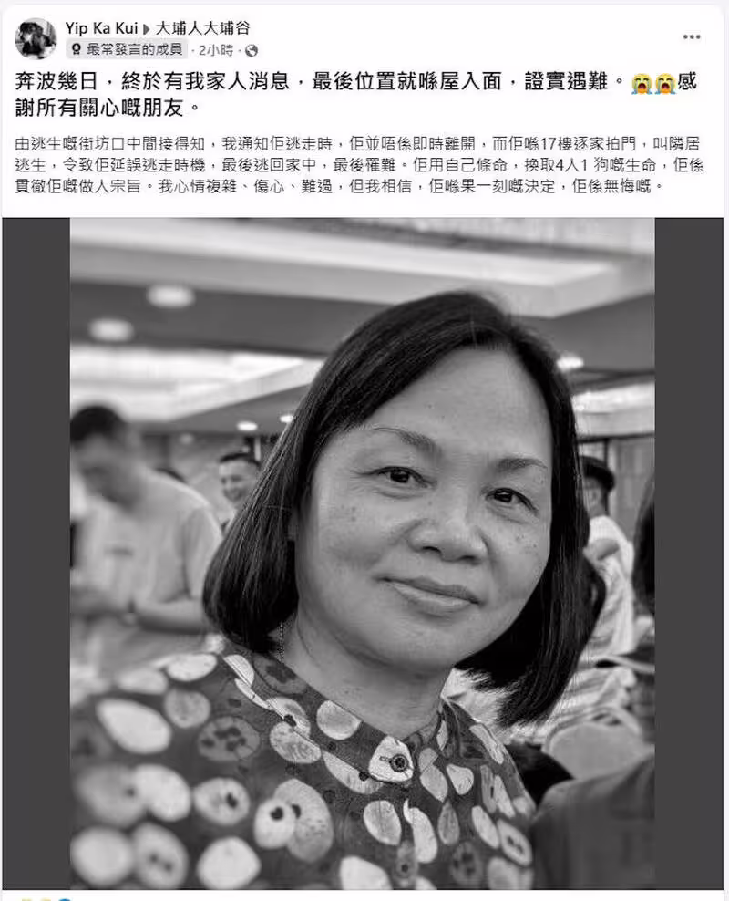 根據《香港01》報導,遇難婦人居住在宏福苑17樓,火警發生初期,她已接獲逃生通知,原本有機會與其他住戶一同撤離。然而,婦人並未第一時間往樓下逃生,而是選擇在濃煙與火勢逼近之際,逐家逐戶敲門高聲提醒「起火了,快走」,為同層鄰居爭取寶貴的逃生時間。