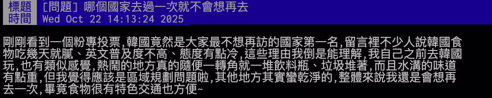 一名網友在PTT以「哪個國家去過一次就不會想再去」為題表示,剛剛看到一個粉專投票,韓國竟然是大家最不想再訪的國家第一名,留言裡不少人說,韓國食物吃幾天就膩、英文普及度不高、態度有點冷,這些理由倒是能理解。