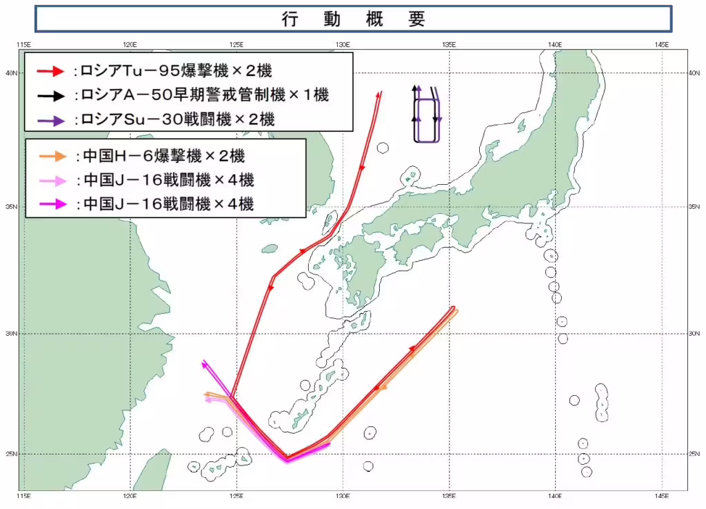 針對這一連串飛行行動,日本航空自衛隊戰機緊急升空實施警戒與監視,好在期間未發生侵犯領空情事。不過日本防衛省表示,中俄這次行動明確意在對日本示威,日本防衛大臣小泉進次郎當日深夜也緊急發文,強調中俄2國已屢次在日本周邊進行聯合飛行,「明確是以對我國進行示威為目的,對我國安全保障構成重大隱憂」。
