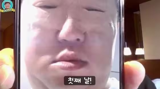 從鄭亨敦公開的手術記錄照可以看到,他第一天「幾乎睜不開眼」,臉部浮腫到輪廓消失,他更自嘲「看起來完全不像自己」,並在照片上搞笑註解「不是被誰打的」。
