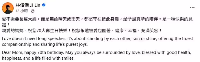 根據媒體《ETtoday新聞雲》、《自由時報》的報導,44歲的林俊傑29日突然在社群曬出一張全家福,慶祝媽媽的70大壽,並有感而發寫下「愛不需要長篇大論,而是無論晴天或雨天,都堅守在彼此身邊,給予最真摯的陪伴。是一種快樂的見證!」而照片中除了他與爸媽,中國網紅「七七」居然也同框合影,自然地站在林媽媽身旁,雙手輕搭對方肩膀,互動毫不生疏。