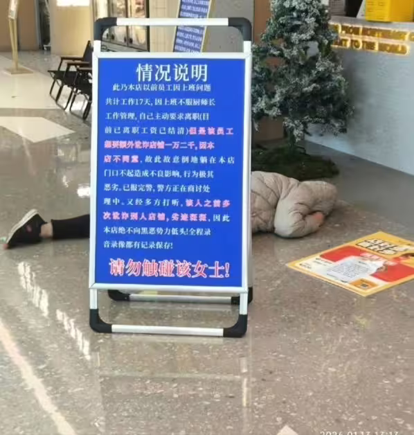 大媽連續四天都來門口趴著,餐廳無奈表示營業額因此掉了一半,店家和商場多次報警也無法制止她,只能做個立牌放在旁邊解釋來龍去脈,並提醒客人「請勿觸碰該女士!」