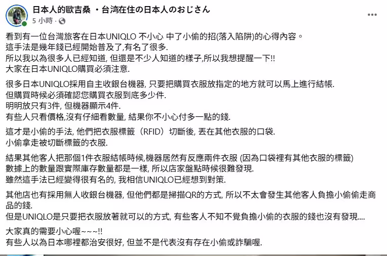 長期住在台灣的「日本人的歐吉桑」看到有台灣人去日本買UNIQLO,未料竟中了小偷的招,決定再次分享這個流傳多年的詐騙手法,提醒在日本買衣服時務必注意。眾多日本UNIQLO分店提供自助收銀機,只要將衣服放在機器上就會自動偵測件數、計算價錢,「有些人只看價格,沒有仔細看數量,結果你不小心付多一點的錢」。