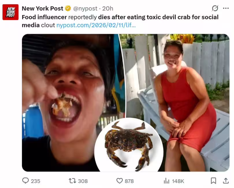 菲律賓巴拉望省公主港市 (Puerto Princesa) 日前發生一起駭人聽聞的食物中毒事件!51歲的美食網紅艾瑪・阿米特 (Emma Amit) 疑似為拍攝社群影片,誤食俗稱「魔鬼蟹」的有毒螃蟹,送醫搶救兩天後,仍不幸身亡。