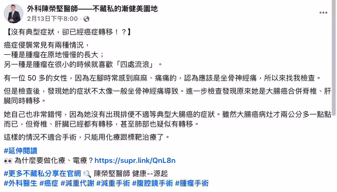 根據《健康2.0》、《中時新聞網》報導,敏盛綜合醫院微創手術中心執行長、一般外科醫師陳榮堅在臉書發文寫下,該名患者的大腸癌原發腫瘤僅約2公分,但癌細胞卻已擴散至脊椎、肝臟及肺部,由於屬於多處轉移,已不適合手術治療,只能採取化療與標靶治療控制病情。