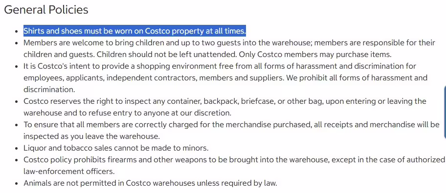 美式賣場好市多近日在全球官網上更新會員規章,明文規定會員進入賣場時「必須隨時穿好衣服和鞋子」,全程嚴禁光腳丫、打赤膊。如果違反規定,將被拒絕入場,嚴重者不排除取消會員資格。