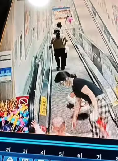 「洢諾」失去平衡跌倒,懷中的女嬰也被甩出,重重摔落在扶梯上,所幸另一名女路人迅速上前抱起孩子,避免扶梯持續運轉造成二次傷害。然而,整個過程中,女子並未出聲示警,也沒有立即上前協助,只是站在扶梯入口處、看著事情發生,態度冷漠。